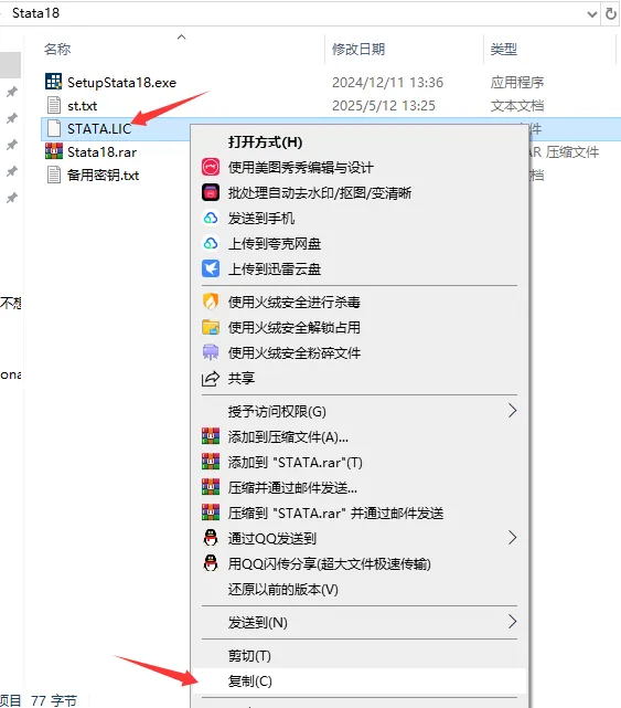 1:返回解压好的文件夹,选中STATA.LIC,鼠标右键选择复制。