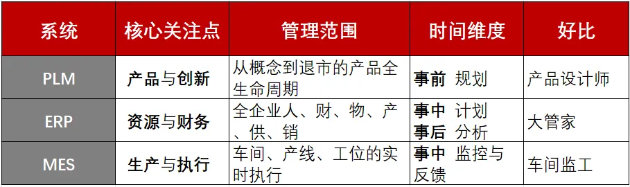 MES、ERP、PLM是现代制造业数字化转型的三大核心支柱系统,它们管理理念不同、关注点不同、解决的问题不同、支撑的战略也不同。