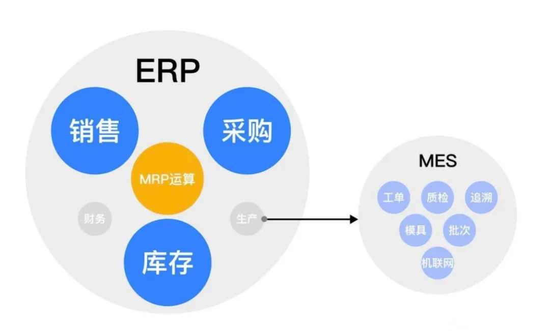 ERP:覆盖企业中长期计划(年/季/月)到短期执行(周/日),贯穿销售、采购、库存、生产计划、财务、人力资源等核心业务流程。它关注的是“钱”和“物”的流动。