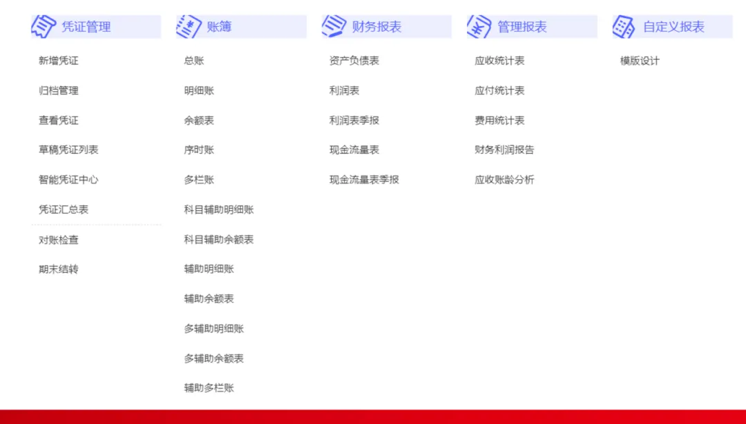 往来账/总账管理/发票管理/税务管理/固定资产等