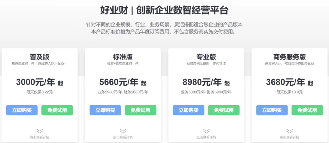 好业财专业版8980元/年起:平均每天32.2元起,功能强大。适合业财深度融合、多部门多公司长流程、深度管控,管理会计分析的,对销售、采购分开流程、发票立账、流程管控、预算费控、资金计划、科目多版本、自定义辅助核算、多机构报表等需求的。