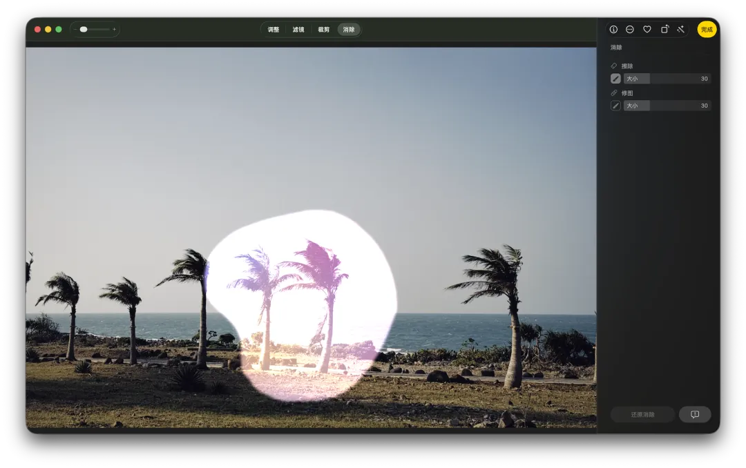 用法上 Mac 的 AI 消除和国产手机的 AI 修图也差不多:进入到 AI 消除模式后,苹果智能会先对画面做一个预识别,自动标示出可能需要消除的人或物。点击、圈选或涂抹需要消除的物件后,苹果智能会自动执行消除和填充的工序。