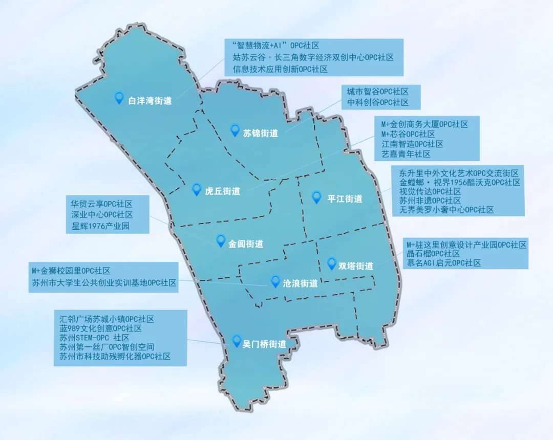 姑苏区坚持“全域布局、差异定位、特色发展”,因地制宜打造三大类型OPC社区,构建覆盖古城、老城、新城的多维创新空间矩阵,现已推出27个人工智能OPC社区。在古城,深挖街巷肌理与烟火气息,打造8个生活化、社交型OPC社区;在老城,依托特色产业载体,打造14个人文气质鲜明的OPC社区;在新城,依托完善配套设施,打造5个现代化、专业化OPC社区。