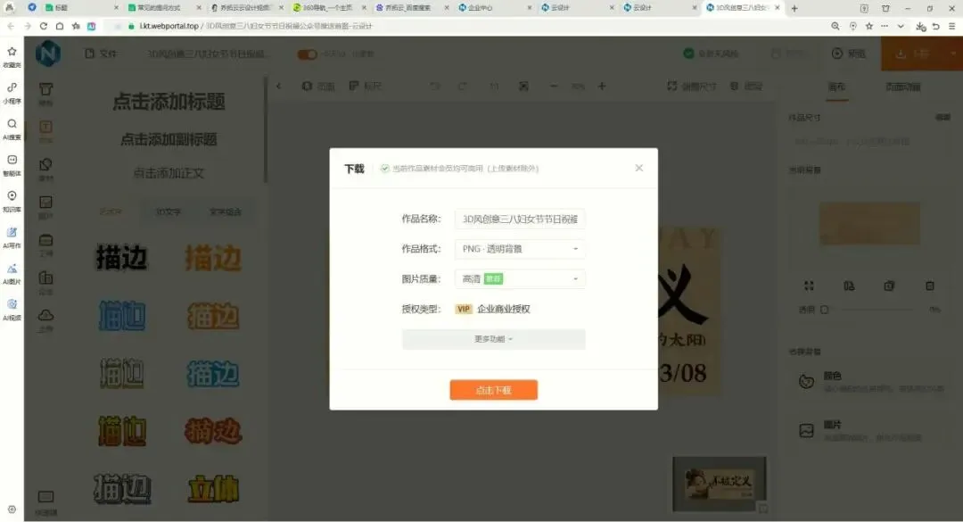 •多格式导出全覆盖:支持PNG、JPG、PSD、PDF、CMYK等全格式导出,其中CMYK格式适配印刷需求,支持单页/多页下载,可规避印刷色差问题;PDF支持PDF/X-1a印刷标准格式,导出时可嵌入字体,避免印刷时字体缺失,线上推广常用的PNG、JPG格式可自定义分辨率,最高支持300DPI,兼顾清晰度与传输速度。