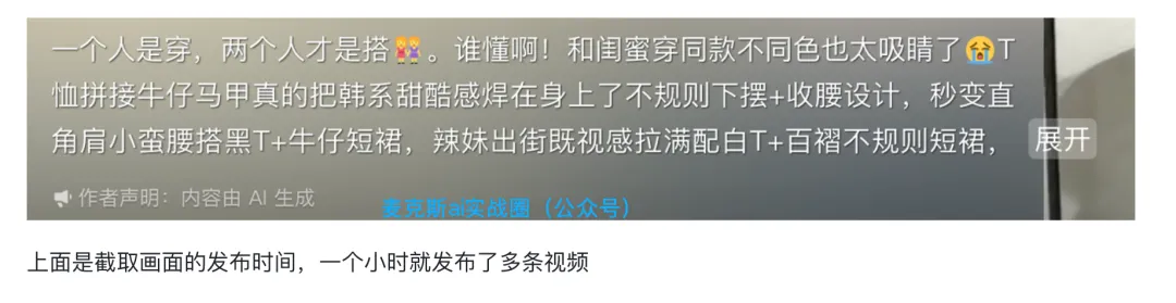 看这个账号的发布时间:一个小时发好几条。一天生成20条不同款式的女装视频,每条挂对应商品,晚上看数据:完播率≥10%、点击率≥5%的置顶,第二天围绕爆款再生成多条不同角度,持续放大。
