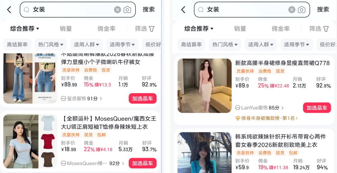筛选条件(记牢!): 佣金比例 ≥20%(20%-30%最佳) 近7天销量 ≥1000件(说明有市场) 符合IP调性(纯欲辣妹就选韩系、修身、简约女装) 客单价70-150元(决策成本低,转化率高) 收藏筛选出的商品,优先选商家提供实拍视频的——方便后面提取动作。