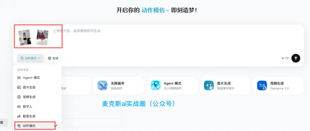 打开即梦AI,选“动作模仿”。 上传:① IP穿衣静态图;② 对标视频(动作参考)。 生成后重点检查: 手部是否畸形(手指融合、少手指) 服装是否变形(运动时条纹扭曲) IP形象是否一致(脸有没有变样) 如果有穿帮,重新生成,或者换一个动作更简单的对标视频。
