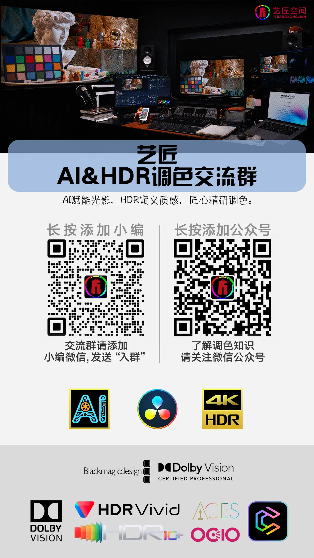 AI时代席卷而来,调色行业也正在悄然变革。有人借助AI高效破圈,有人却因不懂AI而被拉开差距。传统调色技法逐渐难以满足市场需求,而HDR作为新一代影像技术,凭借远超普通画质的色彩、光影与动态范围,已成为行业发展的必然趋势——掌握HDR,才是真正抓住了技术更迭的风口。为此,我们正式开放「艺匠AI&HDR调色交流群」,打造一个专注硬核调色干货的专业交流阵地!