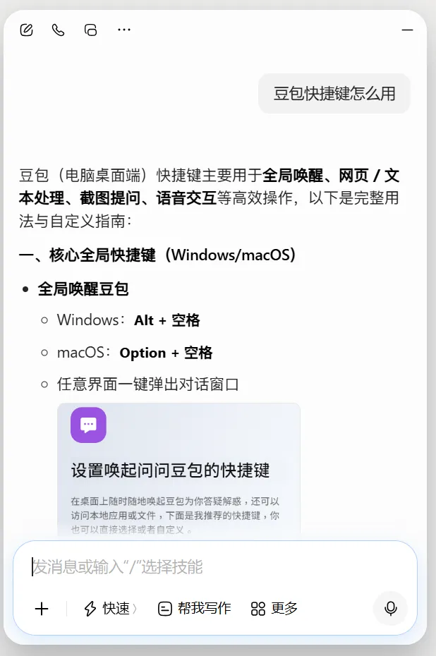 这是豆包电脑版的核心入口,精准贴合Mac用户肌肉记忆,不用找图标、切页面,Windows系统按Alt+空格,就可以召唤出一个“小巧版”豆包。