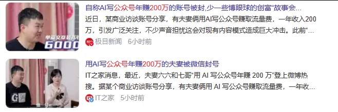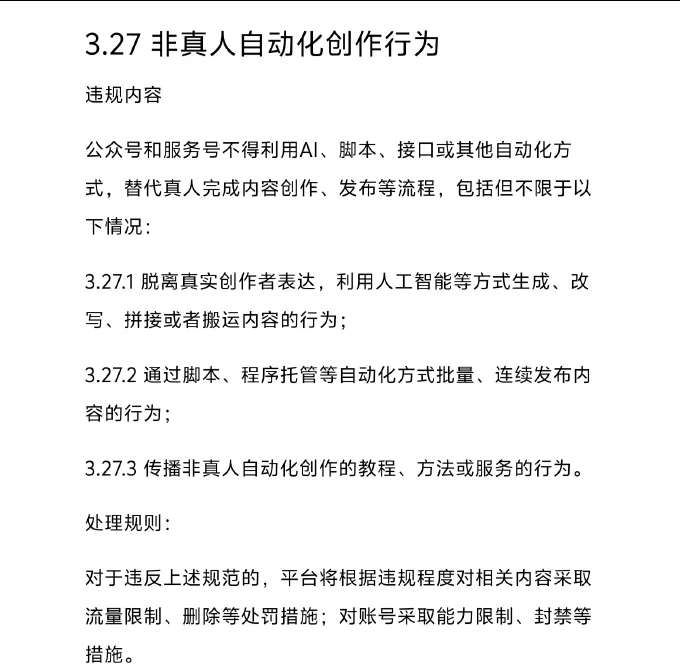 微信开始打击AI写作了今天刷到一则公众号用户反映后台文章被批量删除新闻,提示是被平台判断为“存在非真人自动化创作行为”。打开文章链接提示“此内容因违规无法查看”,由用户投诉并经平台审核,存在非真人自动化创作行为。这个用户是用了第三方排版工具壹伴,是纯手工写的,只是用了壹伴导入。有的用户因为写的是AI写作教程,文章也被删除了。更有甚直接AI写作赚钱,最近直接撞枪口,直接喜提小黑屋。(别太相信此类造富神话,大多是卖课割韭菜的,我们大部分可汲取的知识互联网都能免费搜索到,没必要花钱)但写了几篇公众号文章,我也发现了,如果有用AI输出的内容穿插在文章中,尤其是AI模版开头前缀,像*之类的引号排版的,似乎都会被误判成是AI文章,基本不给导入流量给你,完全无人观看状态,无推荐,好像被大数据关进监狱,根本不被读者发现。所以建议有在写公众号的朋友,在使用大模型AI输出内容时,最好不要生搬硬套,前后加上自己的情绪点缀,不让公众号后台识别出AI的内容,有限的错别字反而能增加存活率