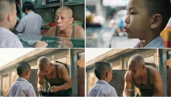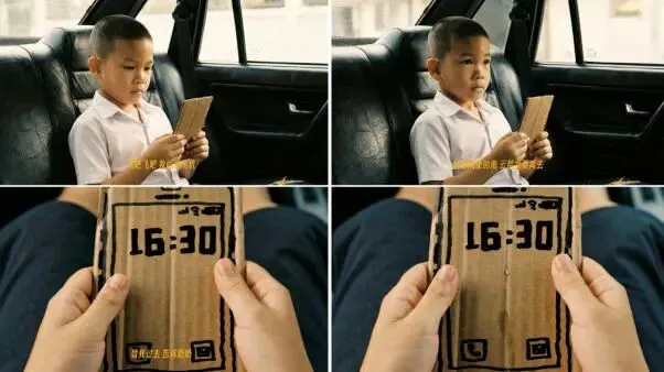 结尾长达一分多钟的车内长镜头,被许多人称赞为“神来之笔”——开往福利院的车上,小男孩静静地捧着“纸手机”,等待永不会响起的电话,伴着AI音乐在纸板手机上落下一滴眼泪。杨选道出了创作逻辑:“亲人的离开往往伴随着长时间的沉默,到一个时间节点才会流泪,这段长时间的沉默,正是中国人的情感内敛的体现。”