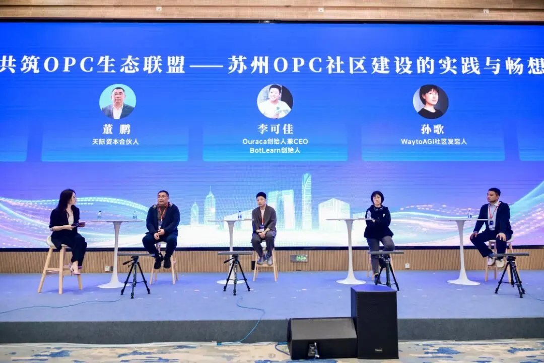 以“共筑OPC生态联盟——苏州OPC社区建设的实践与畅想”为主题,邀请甲子光年创始人兼CEO张一甲担任主持,天际资本合伙人董鹏、Ouraca创始人兼CEO李可佳、WaytoAGI社区发起人孙歌、德丽讯飞创始人徐鹏飞等行业嘉宾参与对话。