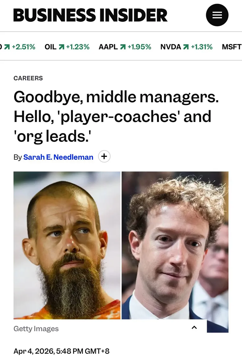 《再见,中层管理.你好,“球员兼教练”与“组织领导者”》《Business Insider(商业内幕)》4月4日的这个标题非常“吸睛”.探讨AI浪潮下的组织变革,从“管理者”到“AI构建者”的范式转移.随着生成式AI技术的飞速发展,全球科技巨头正掀起一场深刻的组织架构变革.