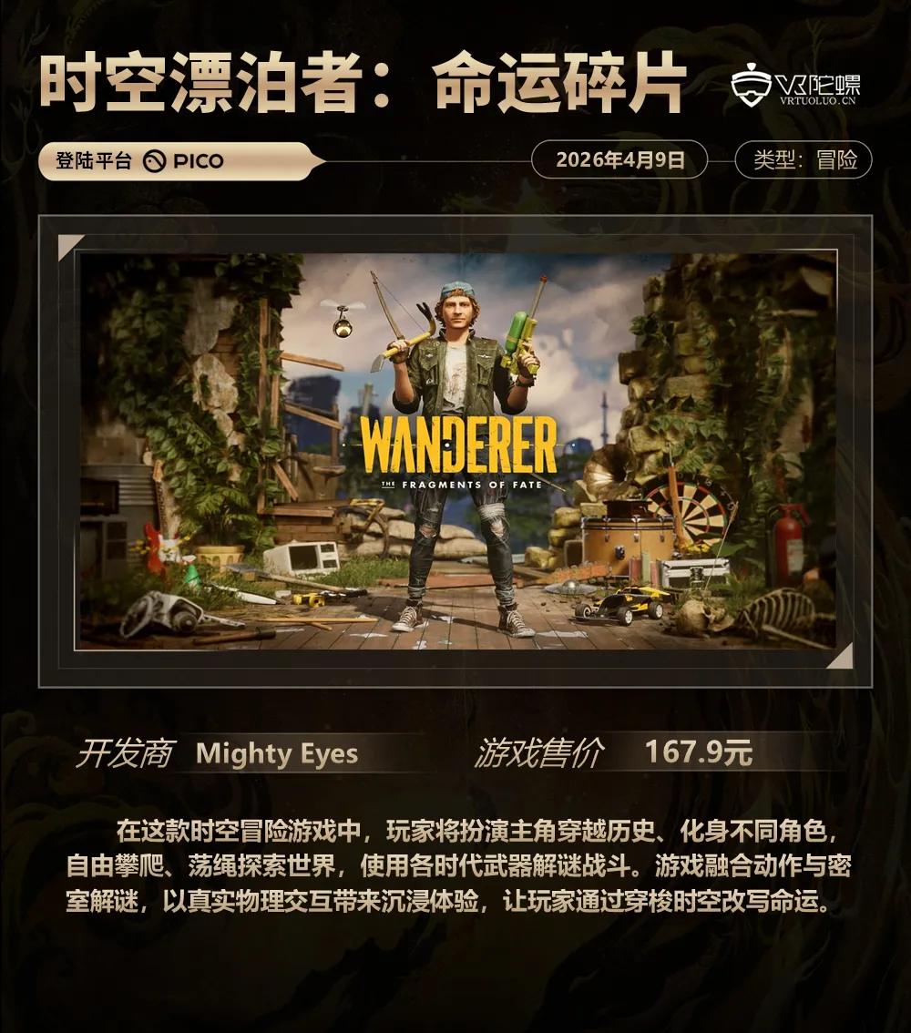 新作方面,由Mighty Eyes开发的VR游戏《时空漂泊者:命运碎片》终于上线PICO,该作于2025年4月登陆PS VR2与Quest平台,并在当月登顶PS VR2欧美服下载榜,现在PICO用户可畅玩这款游戏。