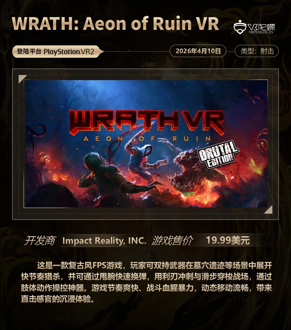 另外,一款名为《WRATH: Aeon of Ruin VR - Brutal Edition》的复古风VR FPS游戏上线PS VR2、Quest以及Steam平台,在这款游戏中,玩家可双持武器展开快节奏猎杀,并可通过甩腕快速换弹。游戏节奏爽快、战斗血腥暴力,喜欢FPS游戏的玩家不妨尝试一下。