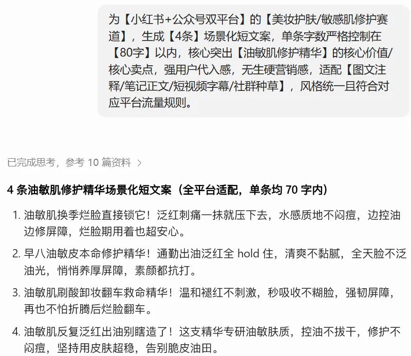 为【目标发布平台】的【内容赛道/品类,如:美妆护肤/母婴育儿/职场成长/科普知识/本地生活/食品家居】,生成【】条场景化短文案,单条字数严格控制在【】字以内,核心突出【推广主体,如:产品/课程/服务/知识点/活动】的核心价值/核心卖点,强用户代入感,无生硬营销感,适配【发布场景,如:图文注释/笔记正文/短视频字幕/社群种草/海报配文】,风格统一且符合对应平台流量规则。