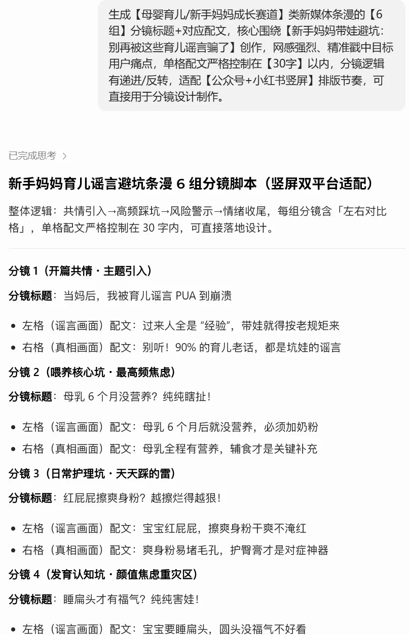 生成【内容赛道/主题,如:职场成长/母婴育儿/美妆护肤/科普知识/民生热点/情感治愈】类新媒体条漫的【】组分镜标题+对应配文,核心围绕【条漫核心主题,如:职场避坑/育儿干货/护肤科普/热点解读】创作,网感强烈、精准戳中目标用户痛点,单格配文严格控制在【】字以内,分镜逻辑有递进/反转,适配【目标发布平台,如:公众号/小红书/抖音/视频号】竖屏排版节奏,可直接用于分镜设计制作。