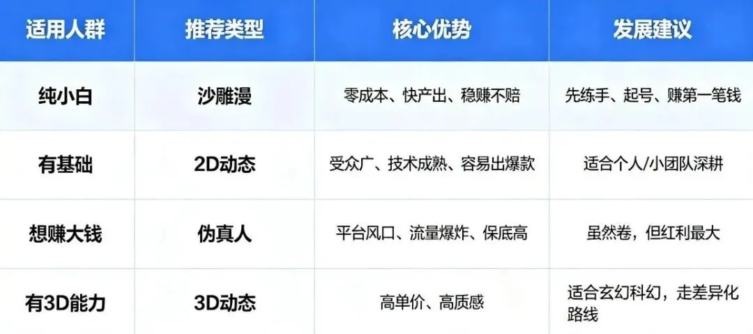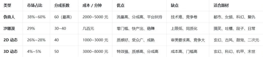 一句话定义:传统 2D 动漫风格,AI 生成精美立绘 + 动态效果,画面精致、二次元感强。数据:百强榜单占比 26%~28%(稳定第三),分成系数 40(中等偏上),成本:1000~3000 元/分钟(中等)爆款:《斩仙台》AI 2D 版 10 亿+ 播放、《规则怪谈》2.5 亿优势:画面精致(二次元用户最爱)、技术稳定、题材广泛(玄幻、修仙、古风、甜宠全能做)、适合 IP 改编(小说改漫剧最多的类型)不足:需一定审美(对画风、配色有要求)、动态效果偏弱(多为静态图 + 微动,不如 3D 流畅)、竞争激烈(工作室多、同质化严重)适合:喜欢二次元/古风/玄幻、有审美基础、会点设计,想做精品、长期 IP、高播放的中腰部创作者一句话定义:3D 建模 + 动态渲染,立体感强、特效炫,适合大场面、玄幻、科幻、机甲题材。数据:百强榜单占比 4%~5%(占比低,但精品多),分成系数 50(仅次于伪真人),成本3000~8000 元/分钟(偏高)优势:质感顶级(玄幻、科幻表现力拉满)、分成高(平台系数 50,收益可观)、辨识度强(3D 质感一眼突出,容易出圈)不足:成本高、制作慢、技术门槛高(建模、渲染、动作调试复杂)、受众偏男性适合:做玄幻/科幻/机甲、有 3D 基础的团队/工作室,走长线精品差异化路线AI 漫剧不是靠 “瞎做”,而是选对类型 + 踩中题材 + 用好 AI。2026 年格局很清晰:伪真人冲顶、沙雕稳赚、2D 主流、3D 精品。不用贪多,选一个适合自己的类型,深耕下去,比什么都做、什么都不精强得多。关注+星标,紧跟最新AI商业创作资讯