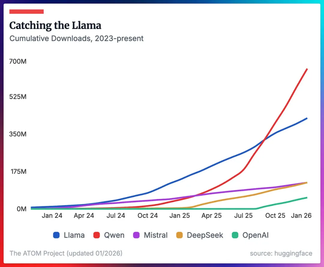 ▲ Qwen(红线)下载量已大幅超越Llama(蓝线)