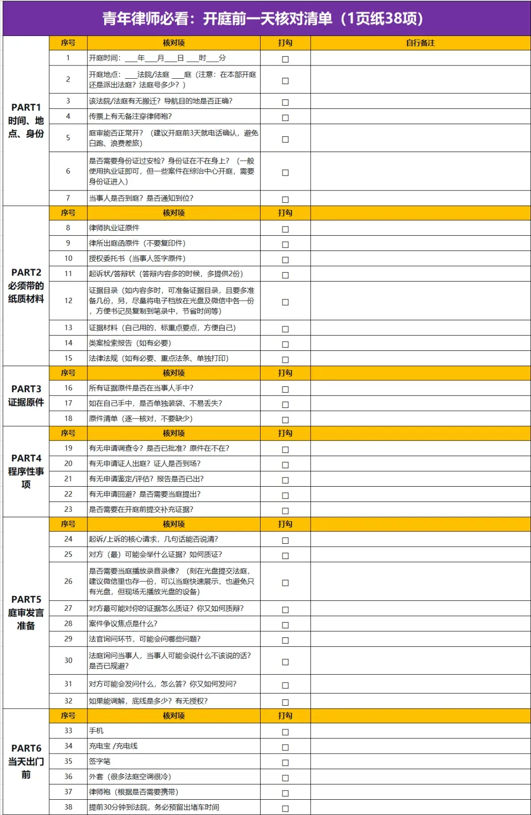 注:本文所提清单,底部有下载链接。执业几年,我依然会在开庭前一天检查系列事项。因为见过太多糟糕的情况。