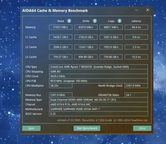 内存测试方面,我们使用AIDA64软件进行测试,测试内存的读取、写入、复制速度和延迟。默认状态下,内存运行在4800MHz,测试结果显示,读取速度为51838MB/s,写入速度为63070MB/s,复制速度为48871MB/s,延迟为94.4ns。这个成绩在默认频率下属于正常水平,内存的读写速度和延迟都控制得很好,能保证电脑的流畅运行,无论是打开大型软件,还是加载大型游戏,都能快速响应。