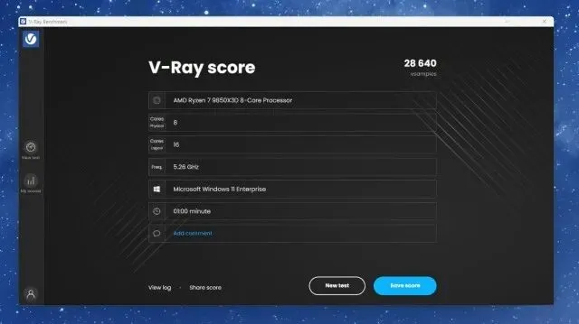 V-Ray测试,超频后的跑分为28640分,相比默认状态的27743分,提升了897分,提升幅度约为3.2%,说明CPU的渲染性能得到了进一步提升,在进行3D渲染、视频剪辑等任务时,速度会更快。