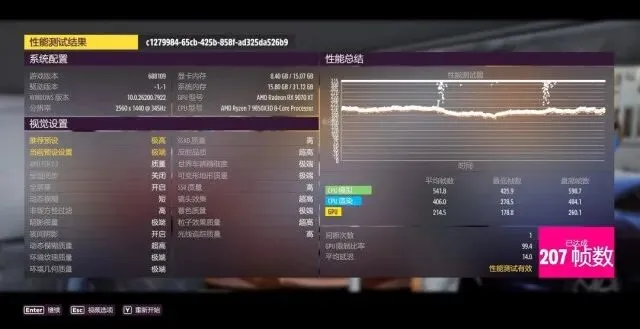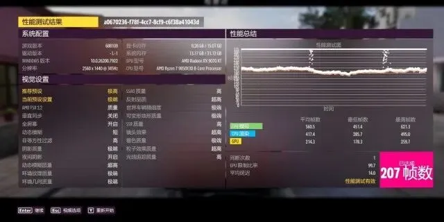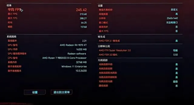 2. 《赛博朋克2077》:测试结果显示,平均帧率为245.42帧,最小帧率为210.68帧,最大帧率为288.27帧,相比超频状态有小幅波动,整体变化不大,依然是显卡作为性能瓶颈,X3D模式对其影响较小。