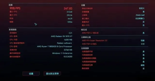 2. 《赛博朋克2077》:这款游戏是一款3A开放世界大作,画面精美,对硬件的要求极高,尤其是开启光追后,对显卡和CPU的压力很大。测试设置为2K分辨率、光追超级预设画质,开启FSR3.0,测试结果显示,平均帧率为247.83帧,最小帧率为213.40帧,最大帧率为292.36帧。这个帧率表现非常出色,即使开启光追和FSR3.0,游戏也能流畅运行,画面细腻,没有卡顿、掉帧的情况,能完美呈现游戏的精美画面。