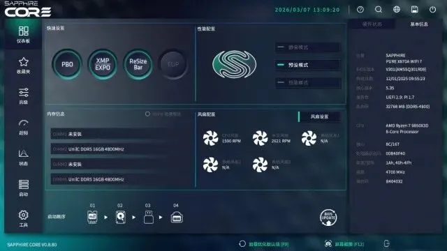 主板:蓝宝石PURE极地X870A WIFI7(ATX大板,16+2+1相供电,支持WiFi 7,配备3个M.2插槽、4根DDR5内存插槽)。