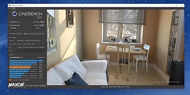 CINBENCH R23测试,这款软件采用Cinema 4D电影级渲染引擎构建测试场景,能更精准地测试CPU的单核和多核性能,测试结果更具参考性。测试结果显示,多核得分23159,单核得分2223,和CPU-Z测试结果基本一致,说明CPU的性能稳定,能在高负载渲染任务中稳定发挥。