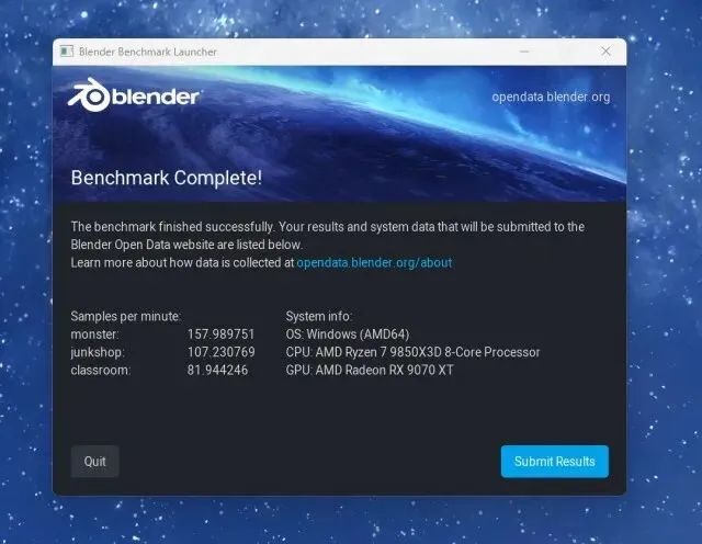 Blender Benchmark测试,Blender是一款免费开源的三维图形图像软件,能测试电脑在3D建模、渲染等任务中的性能,测试包含三个场景:monster、junkshop、classroom,测试结果越高,说明性能越强。测试结果显示,三个场景的得分分别为:monster 157.47、junkshop 104.19、classroom 81.68,这个成绩在高端电脑中表现出色,能轻松应对复杂的3D渲染任务,不会出现卡顿、死机的情况。
