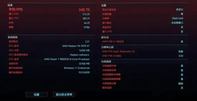 2. 《赛博朋克2077》:测试结果显示,平均帧率为245.70帧,最小帧率为212.25帧,最大帧率为289.79帧,相比默认状态有小幅波动,但整体变化不大。这是因为《赛博朋克2077》是一款3A大作,主要依赖显卡的性能,CPU不是瓶颈,所以超频后帧率提升不明显,这属于正常现象。