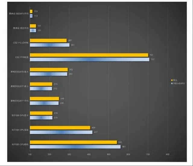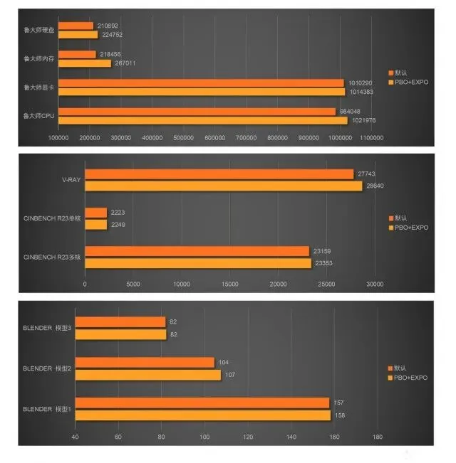 这里给大家补充一点:本次测试使用的是AMD Ryzen 7 9850X3D CPU,这款CPU的性能本身就非常强劲,所以默认状态和超频状态下的性能提升幅度不是特别大。如果大家使用的是AMD R7 9600X、R7 9700X等性能稍弱的CPU,开启PBO+EXPO超频后,性能提升幅度会更大,能更明显地感受到电脑运行速度的提升。