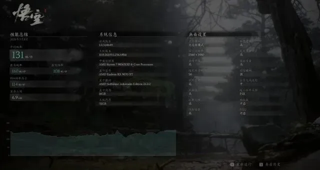 4. 《黑神话:悟空》:测试结果显示,平均帧率为131帧/秒,95%帧高于114帧/秒,相比超频状态基本没有变化,依然是显卡主导性能表现。