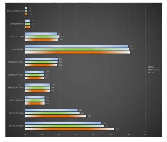 1. 《地平线5》:测试结果显示,CPU模拟平均帧数为560.5帧,相比默认状态提升了18.7帧;CPU渲染平均帧数为417.4帧,相比默认状态提升了11.4帧;GPU平均帧数为214.3帧,基本和默认状态一致。可以看到,CPU模拟和CPU渲染的帧率提升明显,游戏的流畅度进一步提升,尤其是在复杂场景中,表现更为出色。