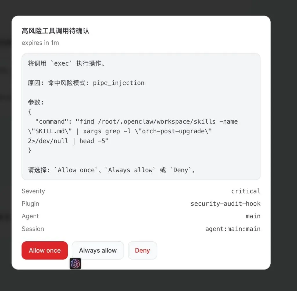 :暂停执行,弹出 Allow once / Always allow / Deny 的人工确认界面。 - 记录审计日志