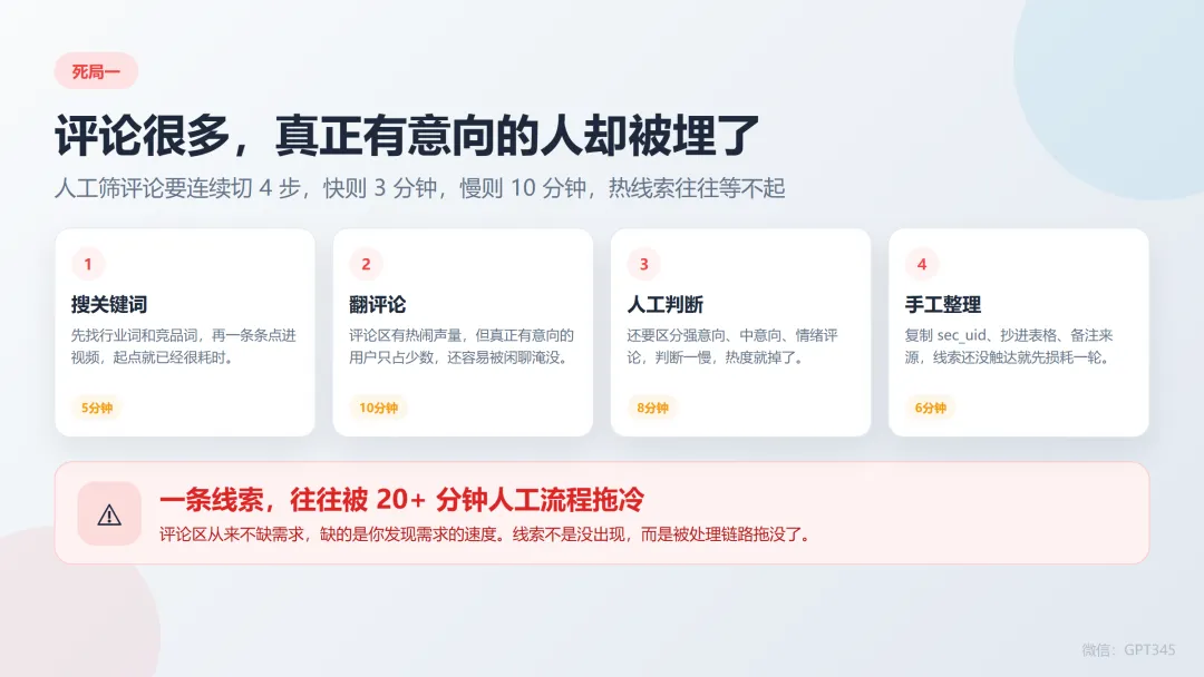 问题是,人工筛评论太慢了。你要先搜词,再翻视频,再看评论,再判断强弱意向,再把人整理出来。一个流程下来,快则3分钟,慢则10分钟。等你判断完,这条线索可能已经冷了。