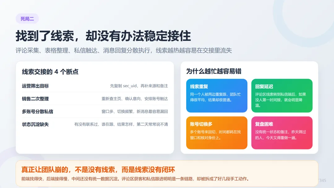 很多团队卡在第二步。前面的人负责找,后面的人负责跟,但两边的信息根本没接上。