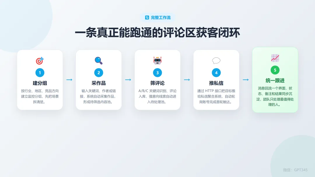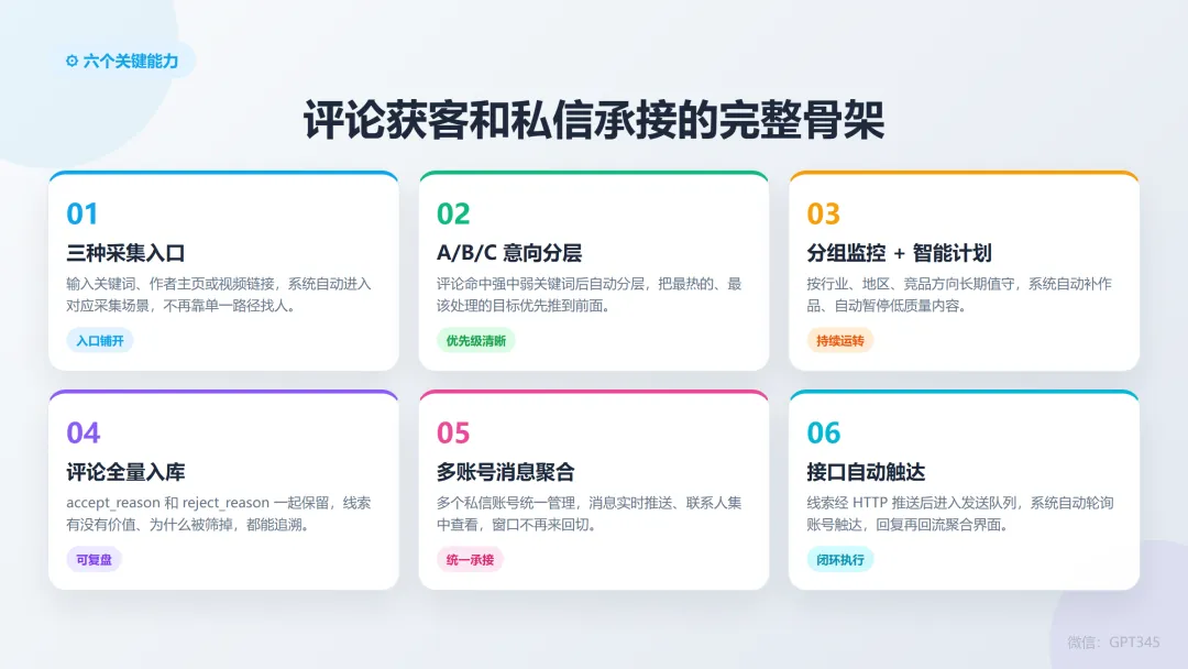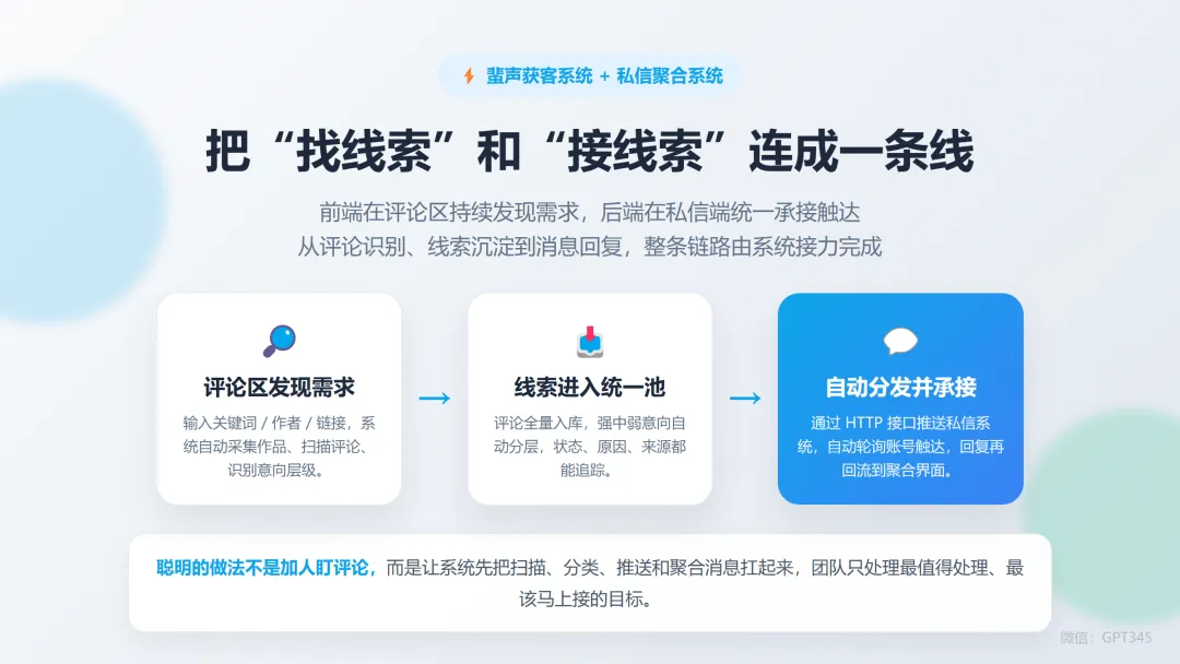 但当你把评论采集、意向识别、线索沉淀、私信触达、消息聚合、自动回复连成闭环后,获客这件事就不再完全靠人盯、靠人记、靠人补。它开始变成一套可以复用、可以复制、可以放大的流程。