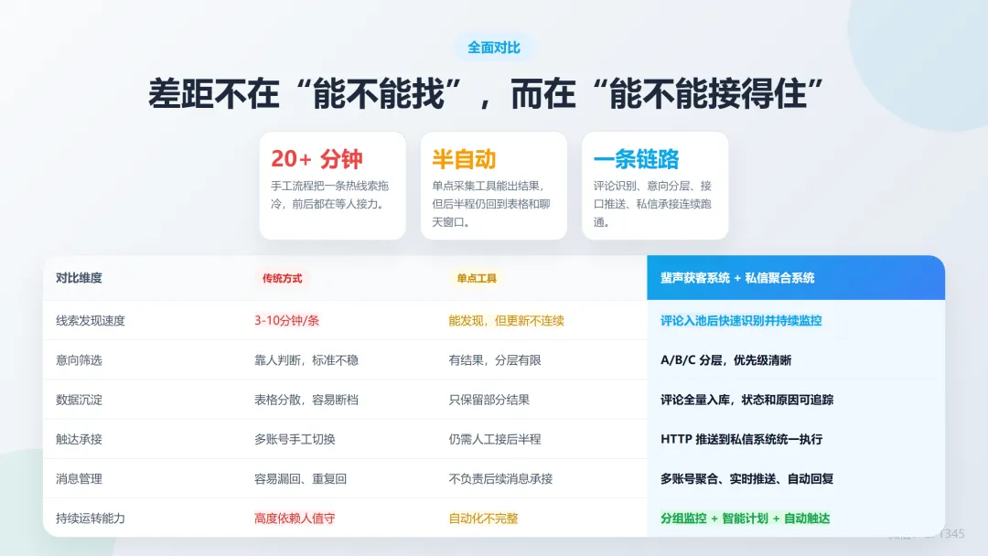 | 触达方式 | 多账号手工切换 | 需要人工接后半程 | HTTP 推送到私信系统统一执行 |