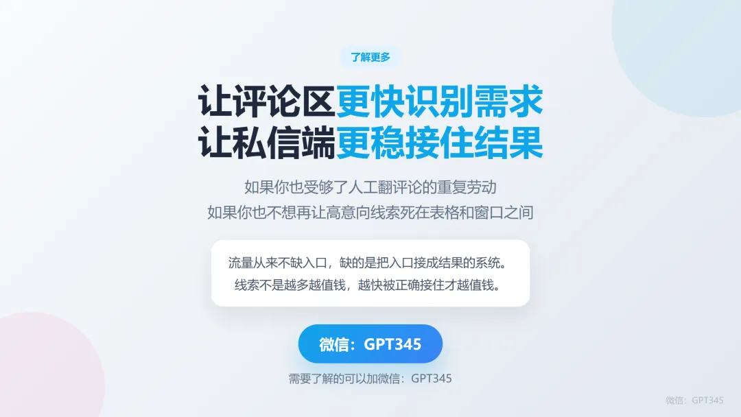 如果你也受够了人工翻评论的重复劳动,如果你也不想让高意向线索继续死在表格和聊天窗口之间,如果你也想把评论区获客和私信跟进真正连成闭环,