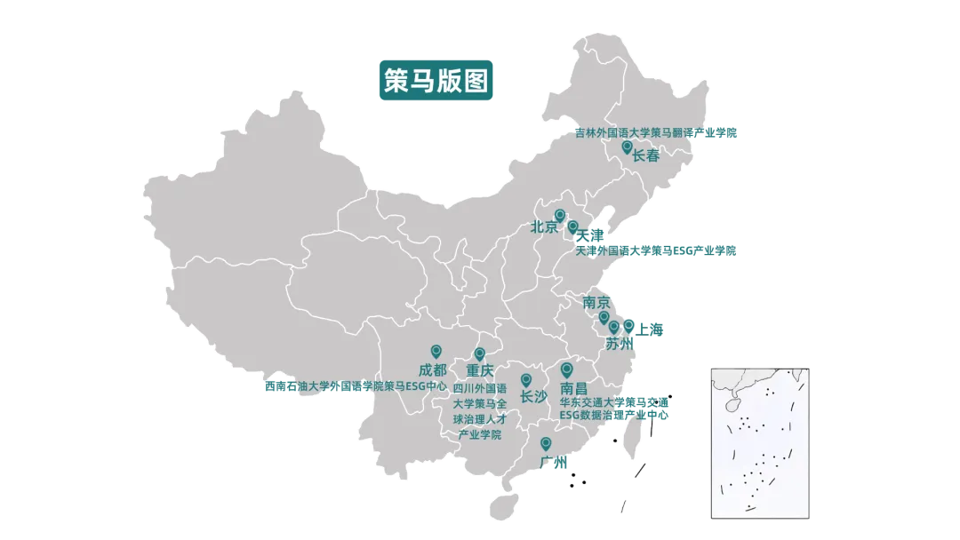策马于2024年5月与天津外国语大学成立中国首家ESG学院,受到《人民日报》、新华社、《光明日报》等权威媒体第一时间报道。此后,策马又相继与西南石油大学、四川外国语大学合作,建立中国首家基于“双一流”外语院系的 ESG 中心——西南石油大学外国语学院策马ESG中心,以及中国西部首家ESG学院——四川外国语大学策马