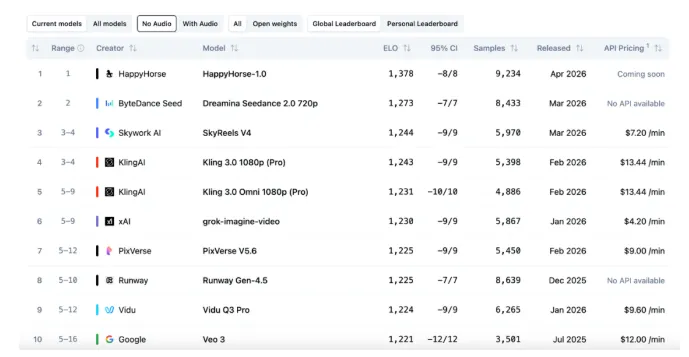 短短两天内,HappyHorse-1.0的Elo评分一路飙升,文本转视频赛道从初始的1347分攀升至1378分,图像转视频赛道从1391分突破至1411分,两大核心赛道双双登顶,将此前稳坐榜首的字节跳动Seedance 2.0远远甩在身后。更令人震惊的是,它与第二名Seedance 2.0的分差达到60至74分,而榜单上第二名到第十九名的累计分差,也不过70分出头——这意味着,HappyHorse-1.0的领先优势,相当于碾压了后续近二十款主流模型的差距总和,其爆发力堪称AI视频领域的“现象级”事件。