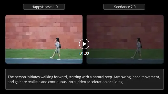 但在复杂场景和细节处理上,HappyHorse-1.0的短板便逐渐显现。在多人跑步场景测试中,它与Veo 3.1 Preview都存在动作分解不彻底的问题,但HappyHorse-1.0的表现相对更稳定,没有出现Veo 3.1 Preview中“凭空冒出毛巾”的穿帮镜头;可与Seedance 2.0相比,它在人物动作的连贯性、物理规律的合理性上仍有明显差距——比如人物跑步时的肢体摆动幅度不够自然,衣物的动态褶皱还原不够细腻,甚至出现轻微的“漂浮感”,这也是不少测试者质疑其综合实力的核心原因。