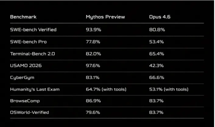 这就是Anthropic公司4月7日发布的Claude Mythos Preview模型。根据所有已发布的基准测试,它是迄今为止功能最强大的AI模型。它在SWE-bench Verified测试中获得93.9%的分数,在USAMO数学奥林匹克竞赛中获得97.6%的分数,在CyberGym测试中获得83.1%的分数。它在所有主流操作系统和主流浏览器中都发现了0day漏洞。所有操作均完全自主完成,无需人工干预。