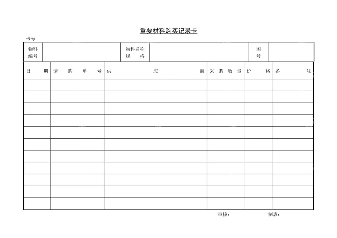 1 重要材料购买记录卡模板