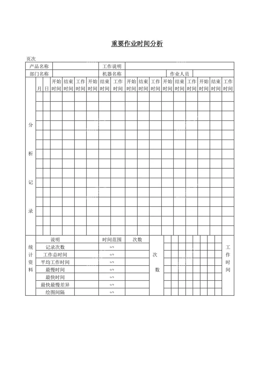 这是一份重要作业时间分析记录模板,涵盖多部门多产品作业时间统计,包含开始结束时间、总时长、快慢差异等核心数据统计项,助力作业效率分析。