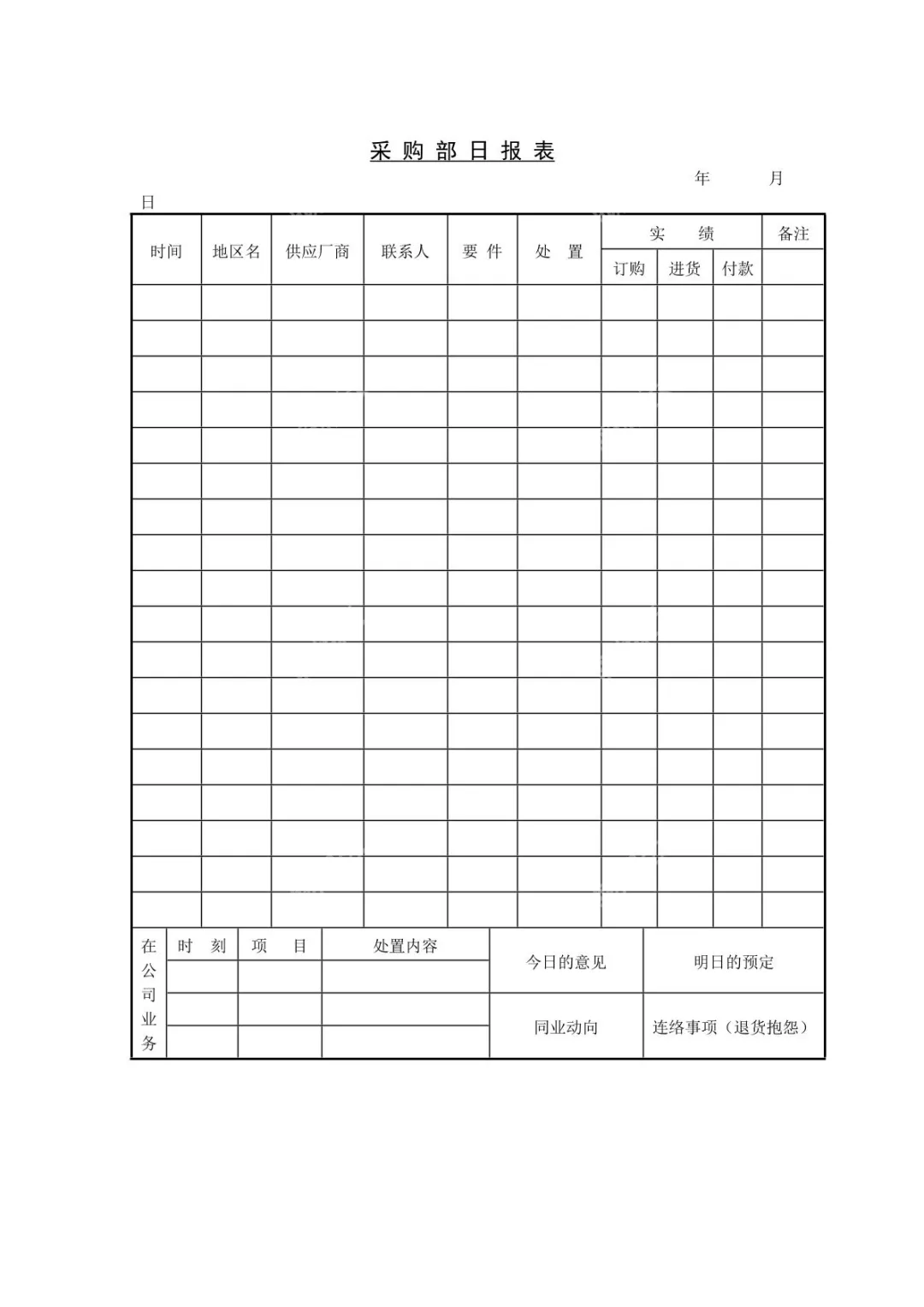 这是一份空白的采购部日报表模板,涵盖订购、进货、付款等采购核心事项,还包含同业动向、联络事项等板块,适用于企业采购日常工作记录与管理。