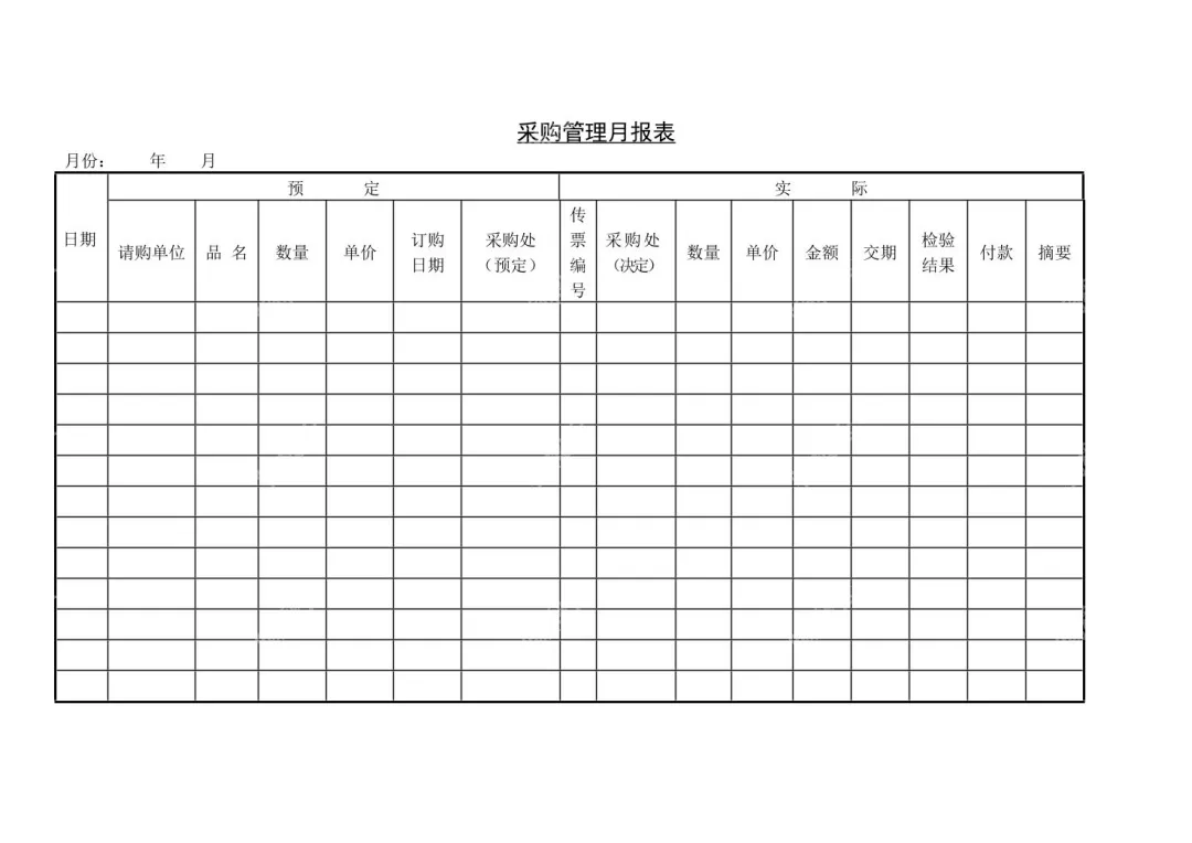 提供标准采购管理月报表模板,涵盖请购、预定、实际采购等核心信息栏,助力企业规范采购数据统计与管理。