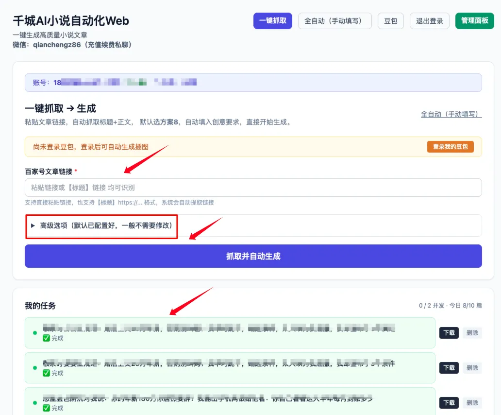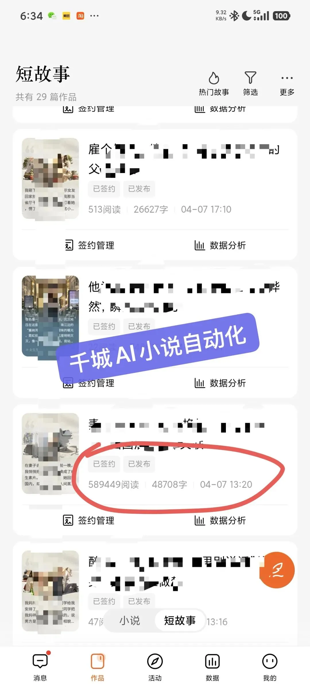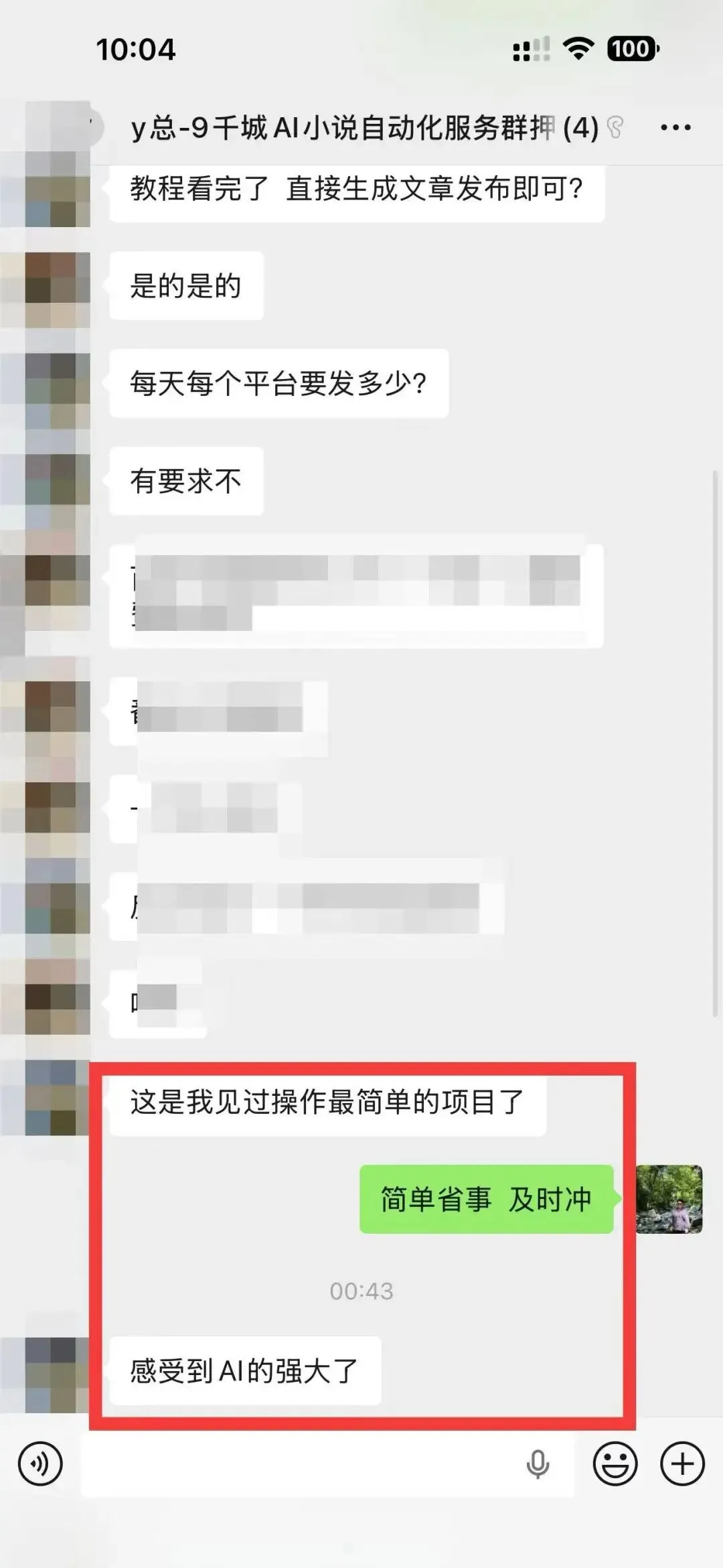 AI小说自动化的稿费出来,我们都被惊到了,竟然这么高,要更使劲冲了距离上篇文章发布,好像也间隔好几天了。先给大家继续看下那篇文章的阅读。上次3万,这才几天直接干到了将近60万,直接快速番了多少番,到手差不多也有2000大洋稿费,着实有点被惊到了。再有,前段时间,一直在等,等我们上个月很随意发了两个号的番茄稿费是多少?因为番茄的规则是上个月的收益是下个月第二个星期四然后显示。所以也都在等,然后出来那一刻,我们都有点被吓到了。两个账号,各自发文中间还断断续续来了一下,但是竟然稿费直接到了将近14000。这还是3月份番茄没有官方活动的情况下。然后目前的4月及其5月还有平台 超高活动,也就是同比3月收益还要继续提升80%-300%。这光看着就异常的爽,也就是上面两个号,下个月很有可能单号到10000以上。我们一方面及时的出课,服务第一批相信的朋友,其次与此同时及时的上号。结果新号一样及时的爆。直接干,我们自己团队直接短短几天,内部扩了30多个号。有钱赚的时候,自然及时的跟上搞起来。与此同时,感觉之前对外的一些合作,价格太低了。最终团队商议,直接全线上调;1) 免得太过于泛滥最后导致很快这波宏利就没了。2) 保障首批,信任我们的朋友,最后也都有一定的收益。不过目前这种经济环境下,也考虑到很多人的一些情况,我们进行了三种合作模式:1)押金合作模式,完了一块分成,我们收益占大头,无风险,押金可退。2)直接一次性买断,后期收益都是自己的。3)当然支持线下,支持线下,支持线下,不过因为占用时间较多,费用肯定更高一些。这块完了各自私聊添加的千城微信即可,未添加最后也会放一个进行。再来看看已经参与进来好友的评价:也是我们之前的老学员了,二话不说,完了直接合作就跟上了。:“最简单的项目” “感受到AI的强大了”哈哈,真实反馈,实操起来也的确这么简单。上篇文章就有简单介绍过整体操作流程:第一步:寻找并采集百家号上已经爆火起来的付费订阅文章。第二步:复制进入我们已经打磨许久的 千城AI小说自动化 工具里面,已经部署在云端,大家完了直接用即可,这里直接用的国外顶尖的AI大模型。自动改写上面文章,并且到了订阅付费部分,也不用付费,直接自动根据情节进行一个改写。基本同时3-4篇生成20000-50000的精彩小说,基本15分钟左右,一键式自动化直接进行完。这个过程后台进行,完了一会打开一看就成,生成完成之后,剩下就是复制到番茄,百家号里面进行发布即可。就这么简单。外加今天也腾出时间,给大家录制了一个整套简单流程,及其新号后台,顺便进行一个附带: 已关注 关注 重播 分享 赞 视频详情 下来就是最近更多忙团队内部的事,然后朋友圈没怎么发的情况下,之前好多个老学员,直接过来上车。一句句 “相信老师” 外加 “相信我们的交付质量” 有一说一还是挺感动的。腾出时间,及时给大家反馈说下,完了也该继续跟上,继续冲了的。这么好的机会,自然也要及时冲起来的。然后三种合作方式,押金分成;买断;线下手把手。上面已经说到,感兴趣,各自私聊添加的千城微信即可,现在依旧特价,后期会往上涨价。未添加微信的,可加下方企微,免费咨询,及其邀请 免费的交流群。其次也有一个千城陪伴群,付费进入,不过门槛不高。19.9 后期人数上涨,最终到99,分享一些感悟,及其我们做项目的一些进程分享。感兴趣也可私聊各自添加千城微信。
